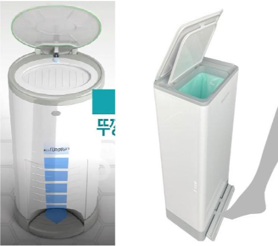 기존 매직캔 제품은 ① 발로 밟아 뚜껑을 열고 ② 속뚜껑을 한 번 더 누르는 형식이라