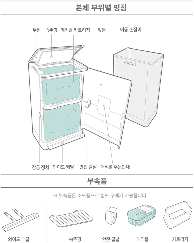매직캔 히포는 본체(뚜껑, 잠금 장치, 이동 손잡이 등)와 부속품(페달, 속뚜껑, 안전 칼날, 매직롤, 카트리지)으로 구성되어,