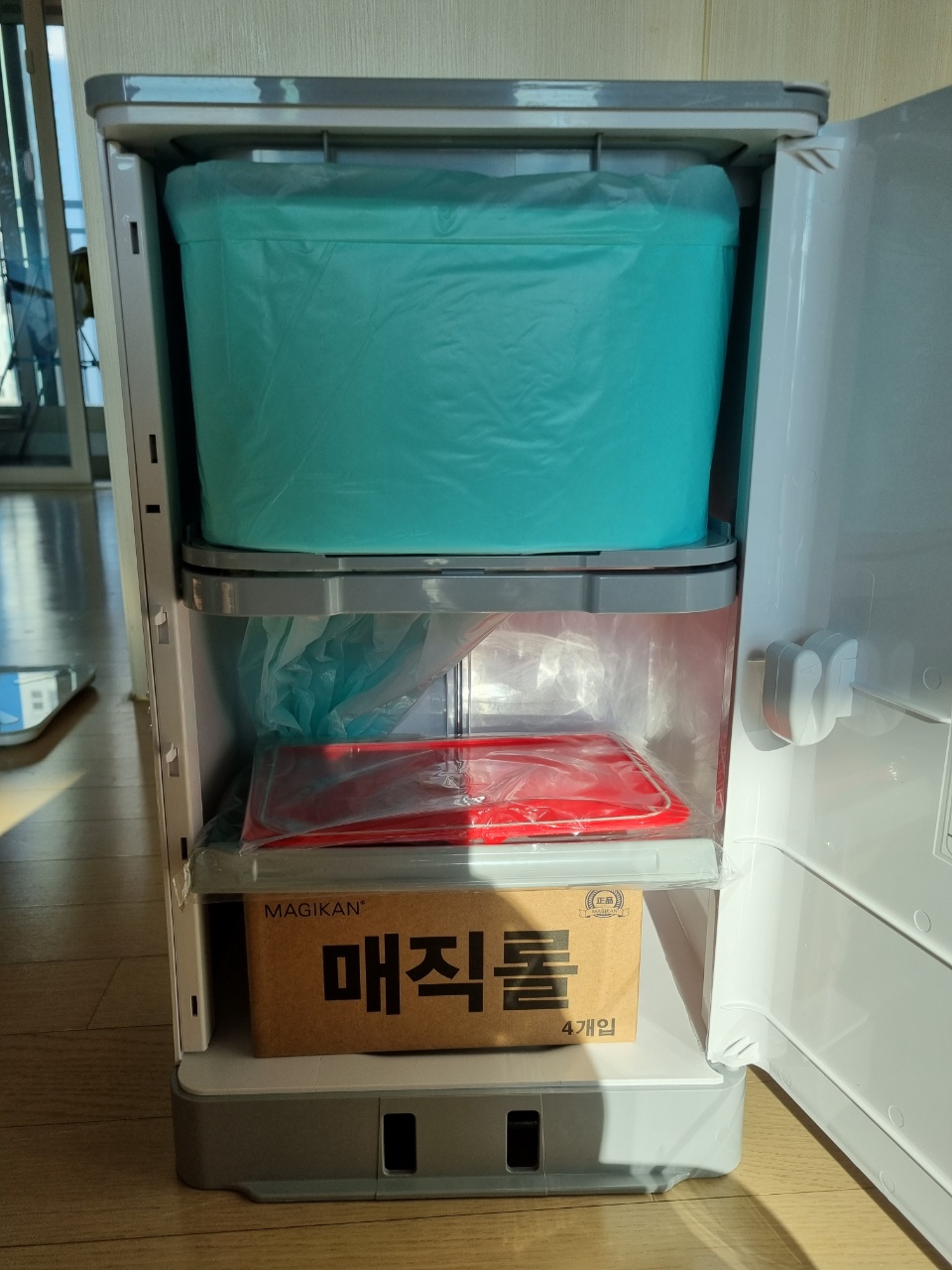 기존에 사용하던 매직파워 압축 쓰레기통과 비교해서 장단점이 있지만,